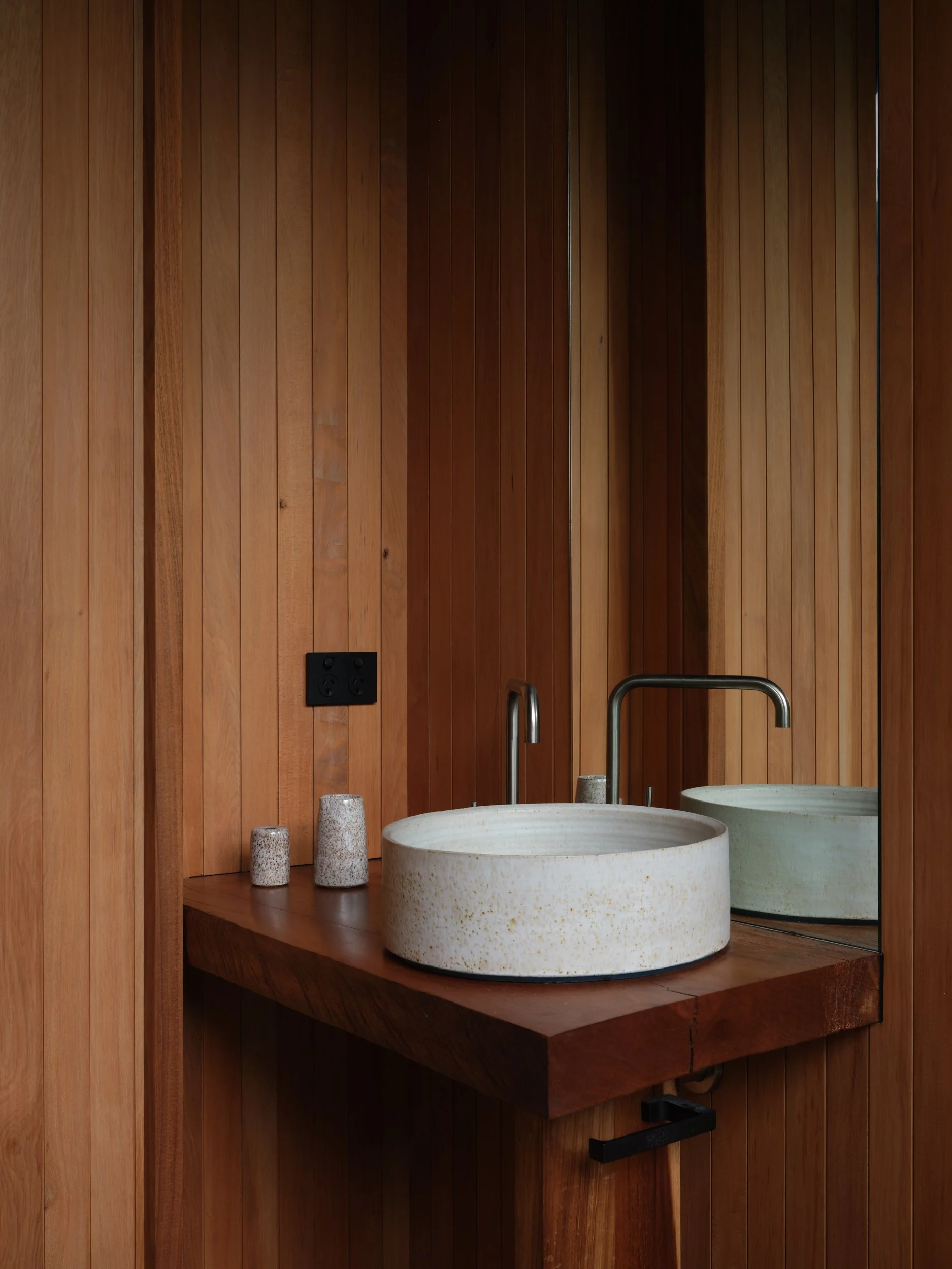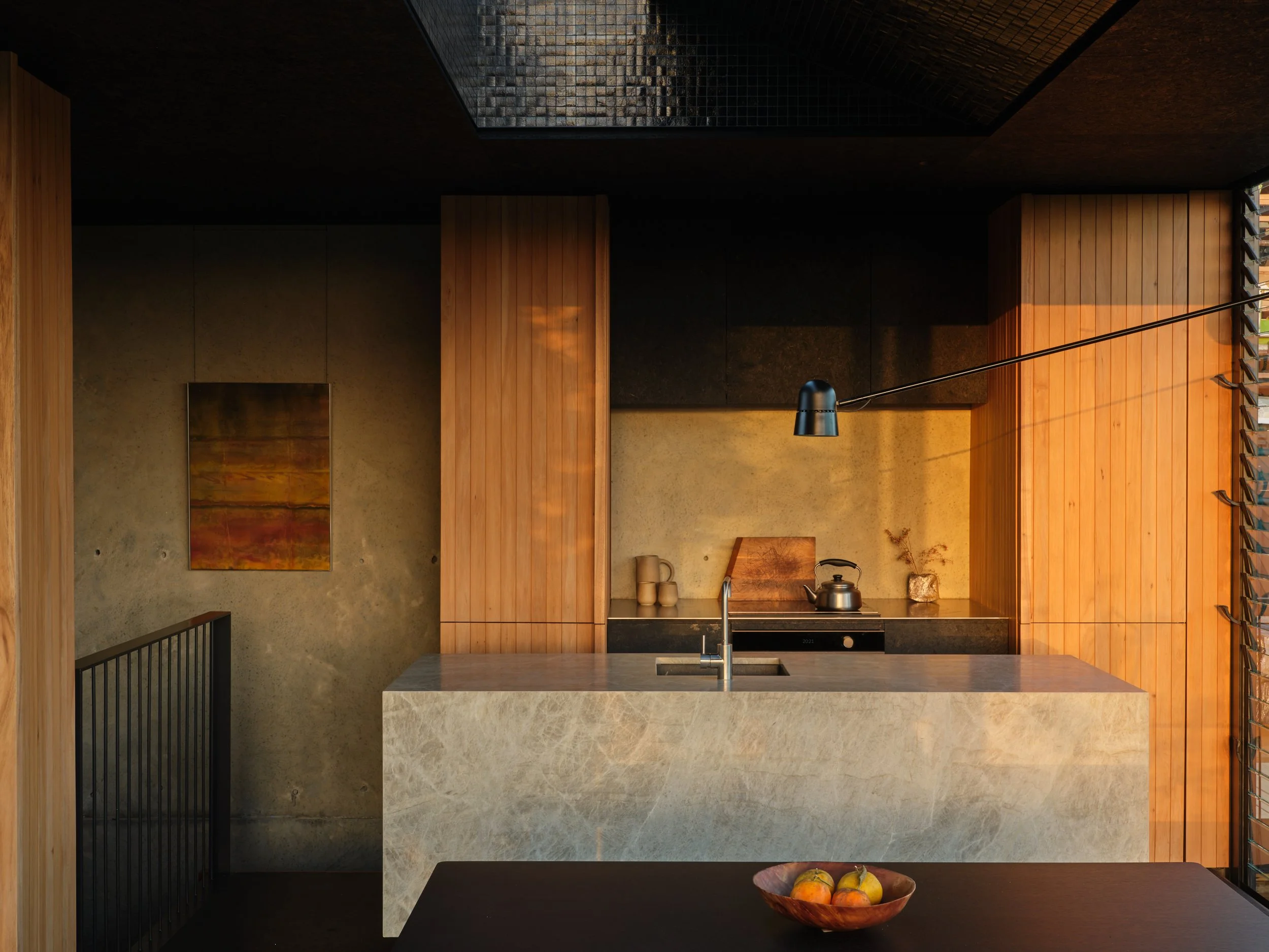 Light, shadow and materials have a symbiotic relationship here. The robust external form opens up from within, with glazing providing a connection to the wider streetscape and surrounding natural elements. Light and shadow inform an ever-changing palette. Exposed concrete forms a thermal moderator, black floors and ceilings compress and absorb light, Totara timber wall linings provide warmth and consistency for the vertical elements in the room, while the stone bench is raised on a plinth to create an anchor to the space – designed as a piece of furniture.