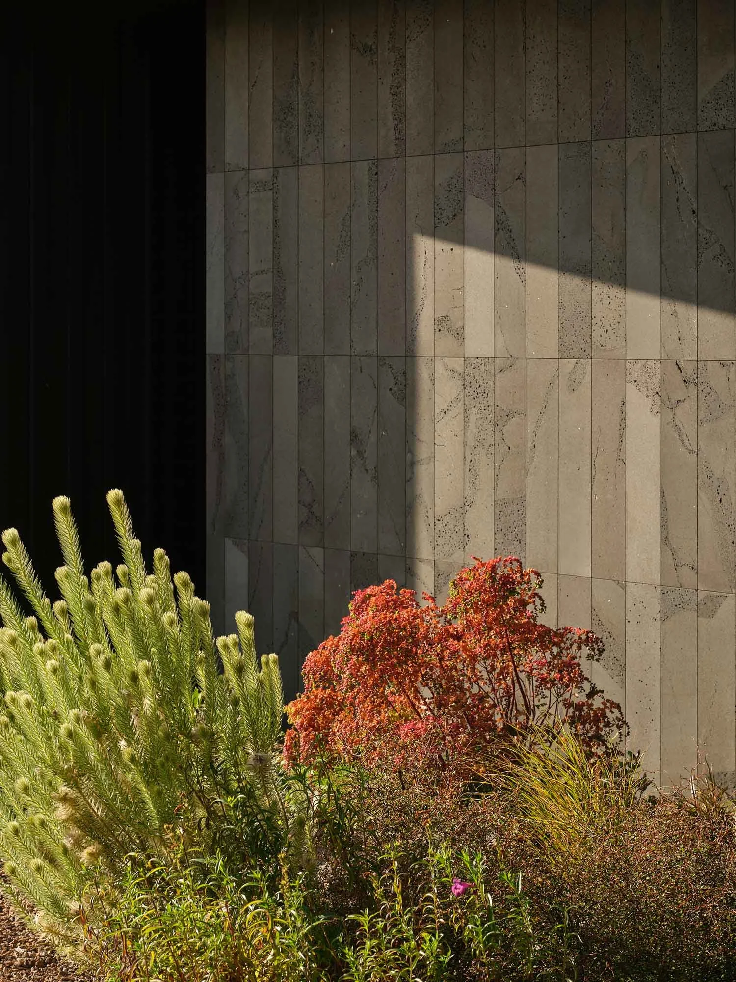 Between the anchor walls, the program is “punched” into spaces of varying depth according to function — open, glazed living zones where connection to landscape is paramount; more enclosed, stone-clad elements where privacy and shelter take precedence.