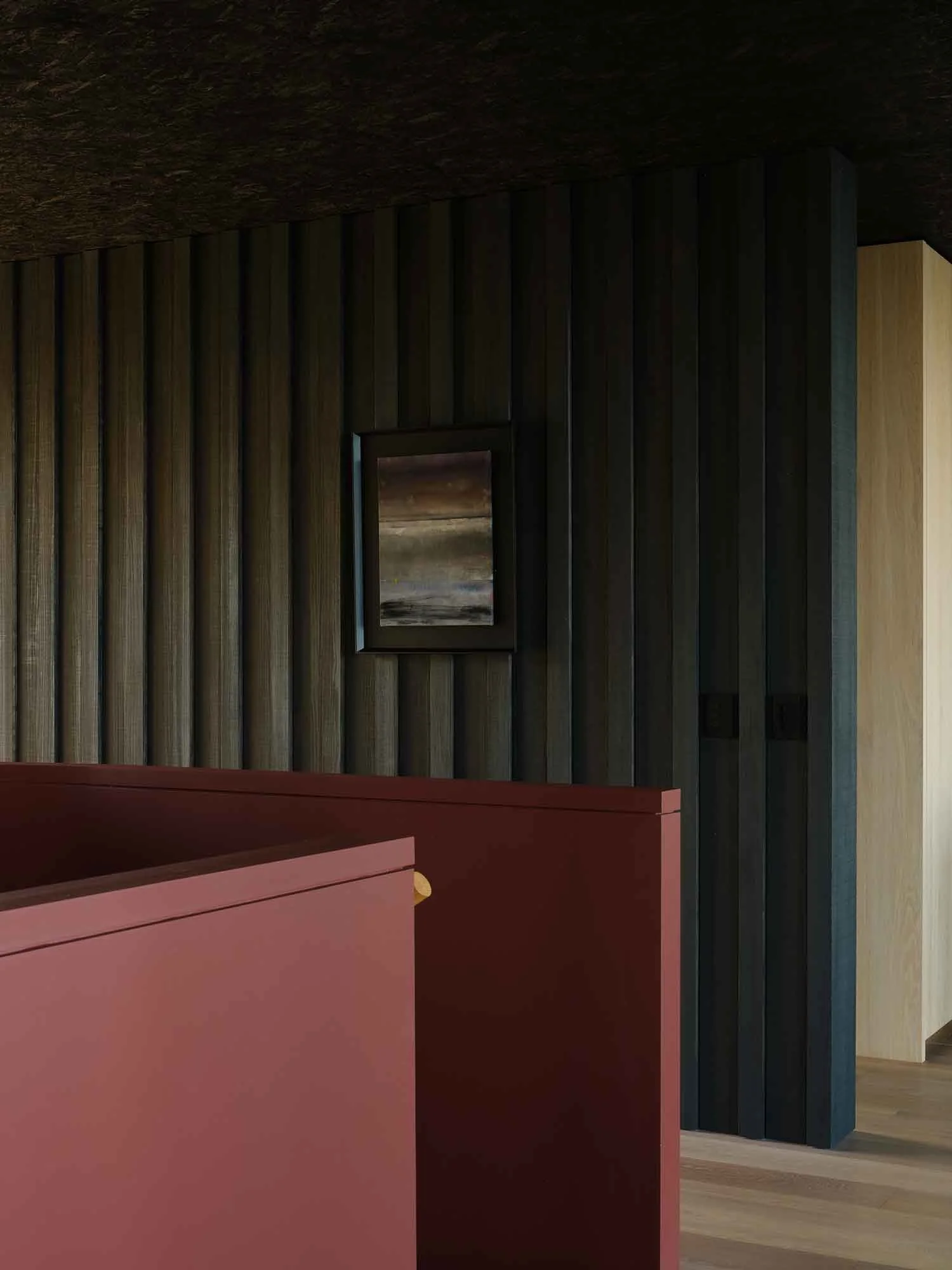A single accent colour, Scoria Red, threads through the home in the stair, hearth, kitchen splashback, and bathroom tiles — a warm, earthy constant that connects interior details but expressed in a range of textures and finishes. This careful layering of tone and texture establishes a mood of calmness, stillness, and retreat, a familiar touch point throughout the home.