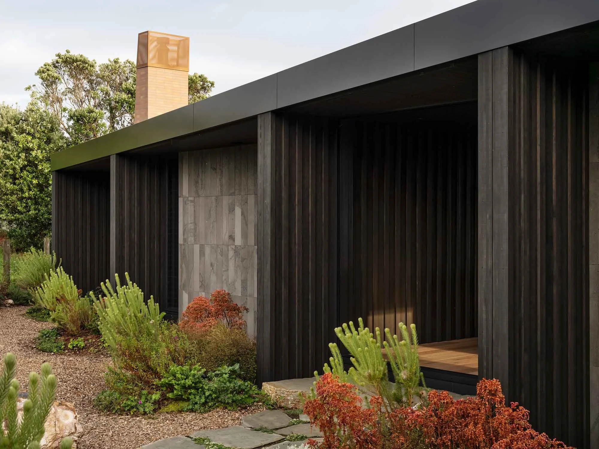 Working with landscape designer Xanthe White, the house is set within mounds and plantings that draw the surrounding vegetation right up under the eaves. This blurs the line between architecture and nature and enhances the sense of being embedded within the site. The approach from the driveway presents a low, single-storey profile that dips in and out of the terrain, before revealing its two-storey face to the sea.