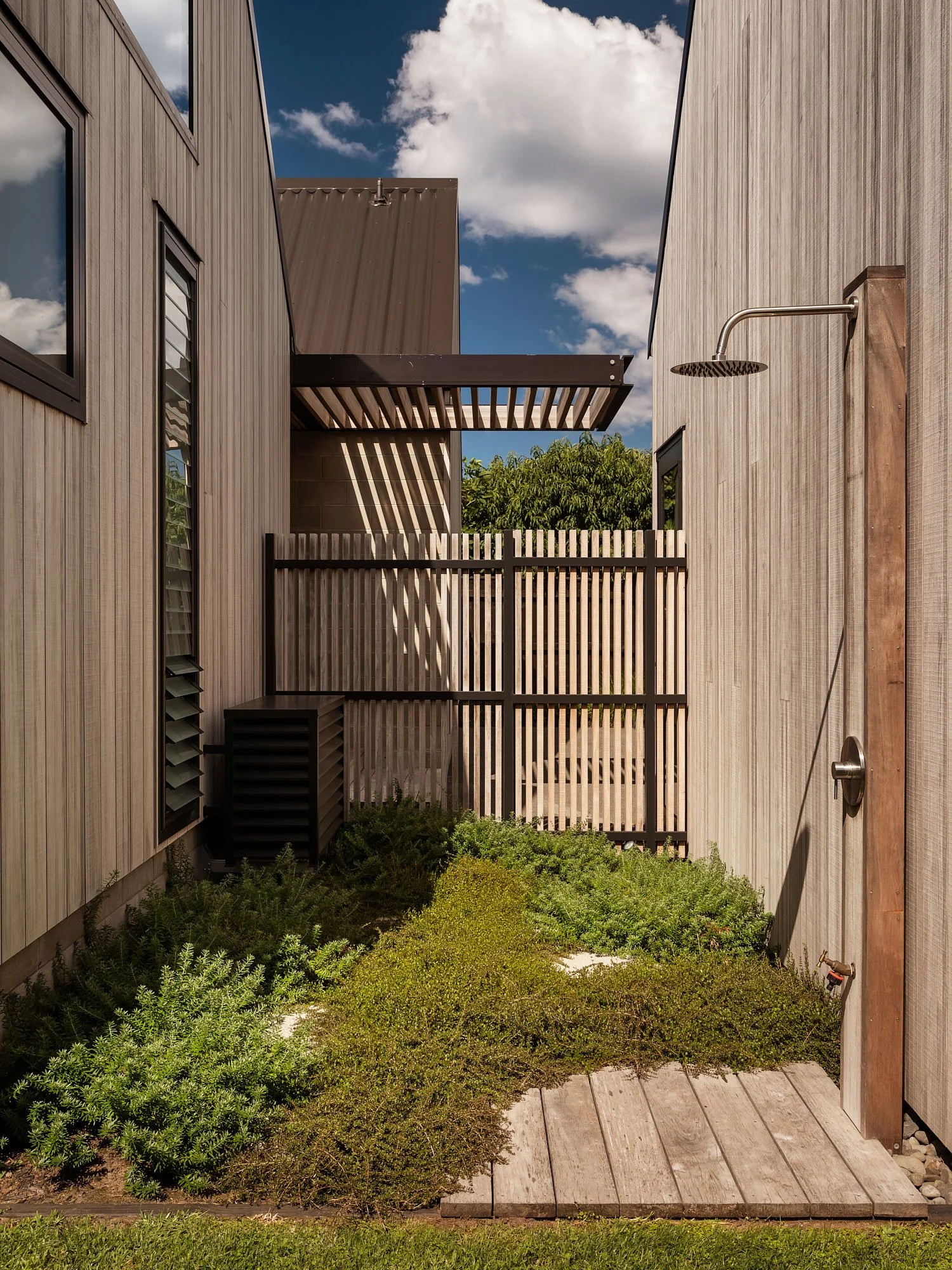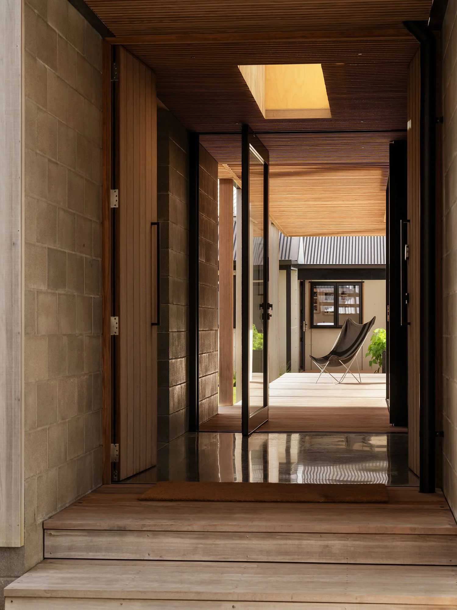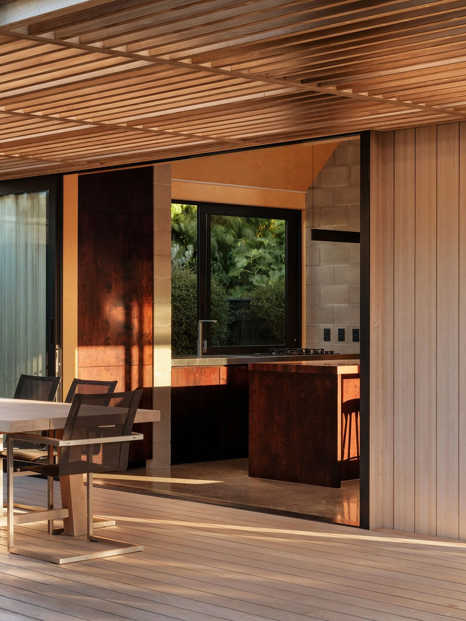 The central covered boardwalk, serving as the spine of the home, is a unifying element that ties together the series of forms. Pivot doors and over-wall sliders allow the openings to seamlessly disappear, blurring the lines between the interior and exterior. This central spine directs the flow through the new home to the bach beyond - establishing a clear sightline upon entering the home and preserving the connection to the original structure. A series of split posts define the edge of the boardwalk and create a soft boundary between the house and the surrounding grassed area - a gentle transition between spaces.