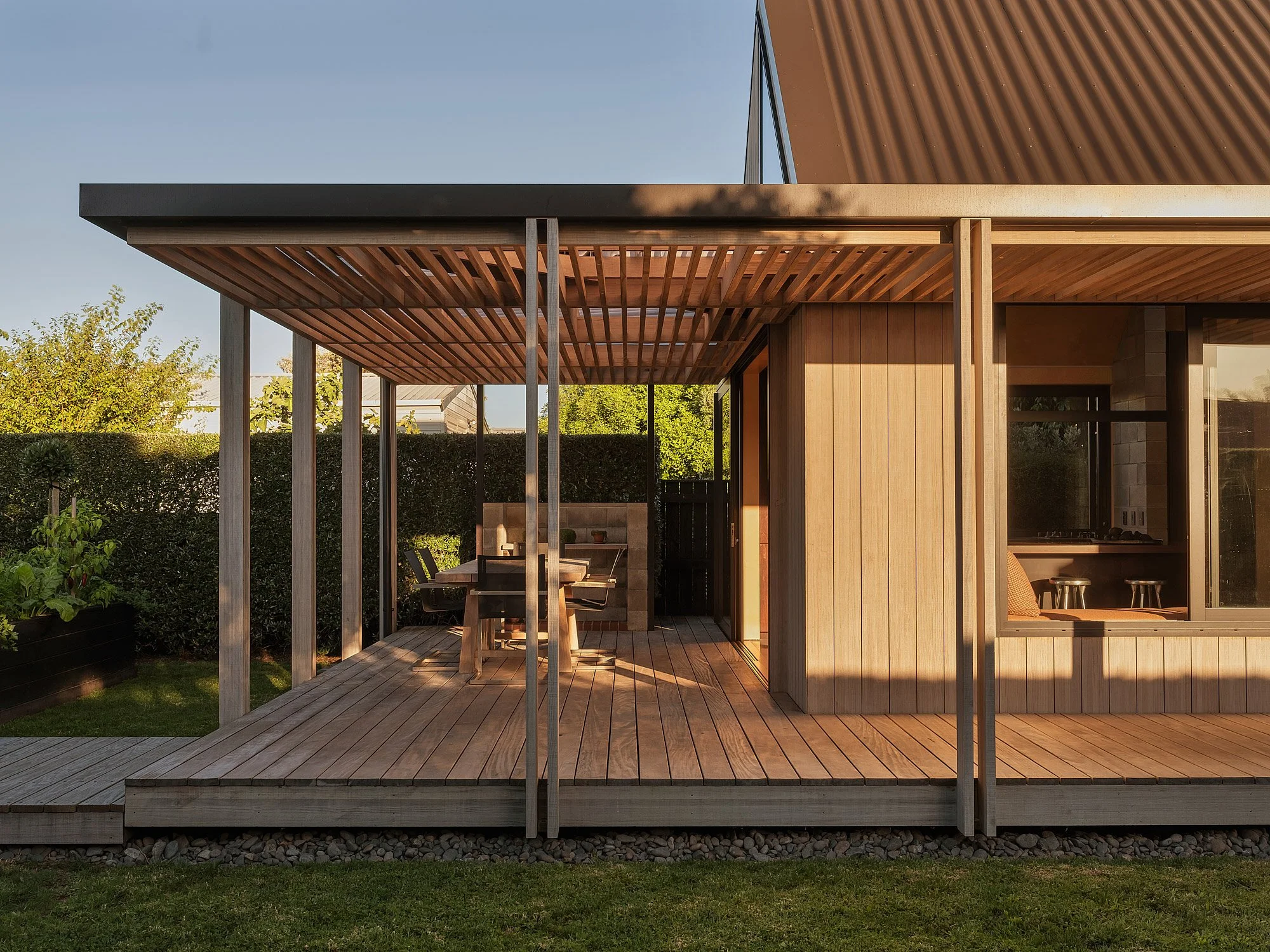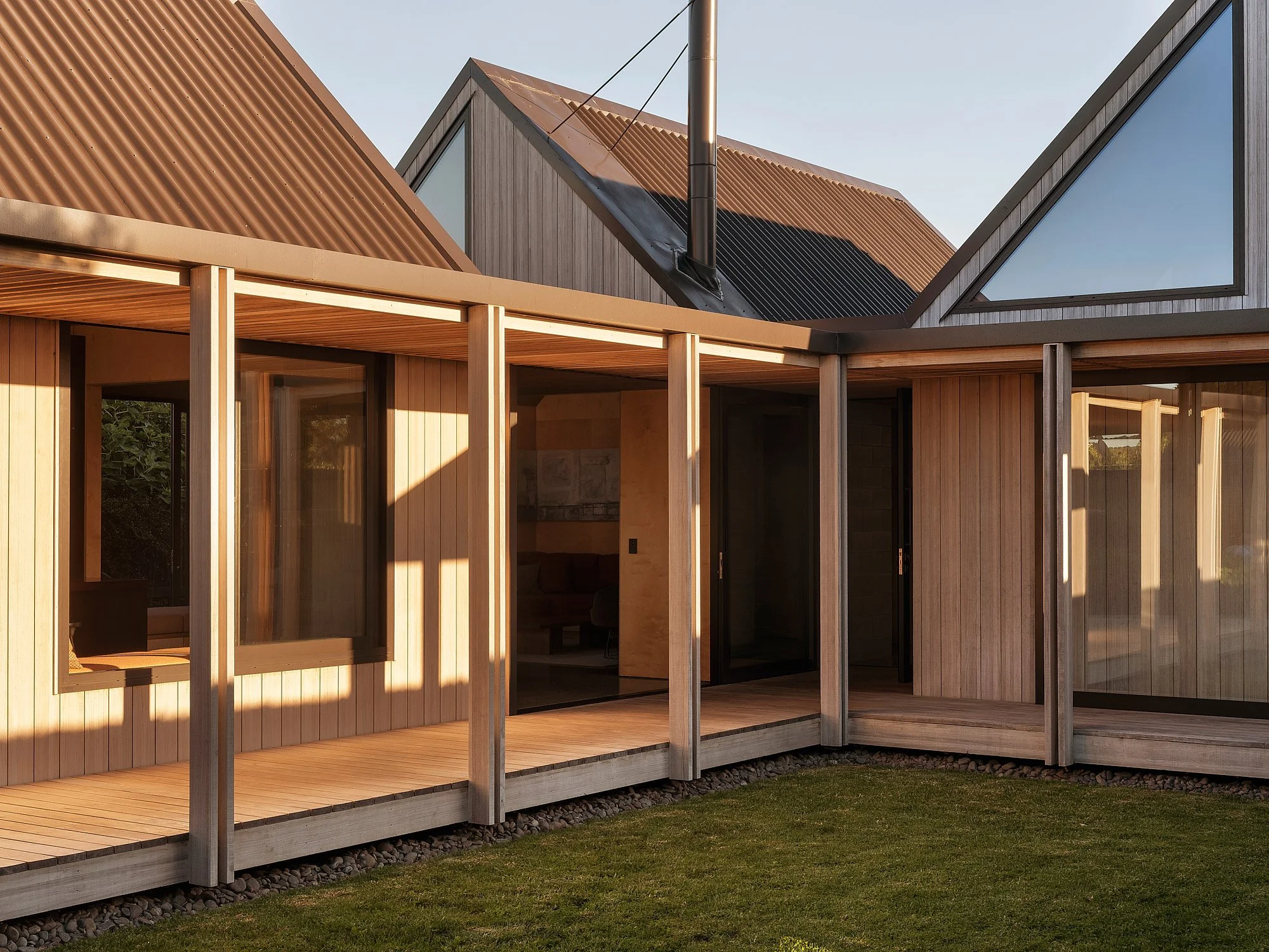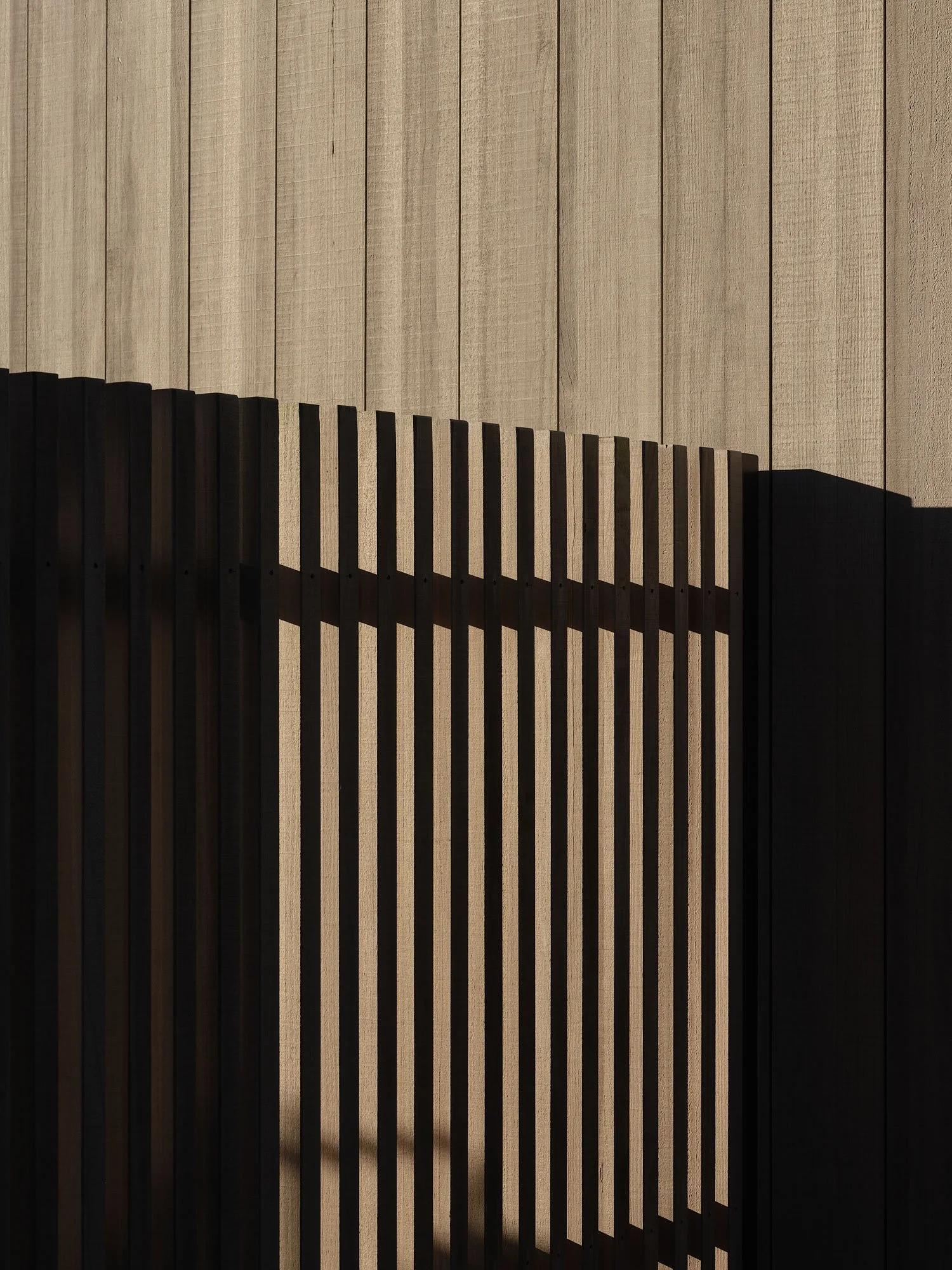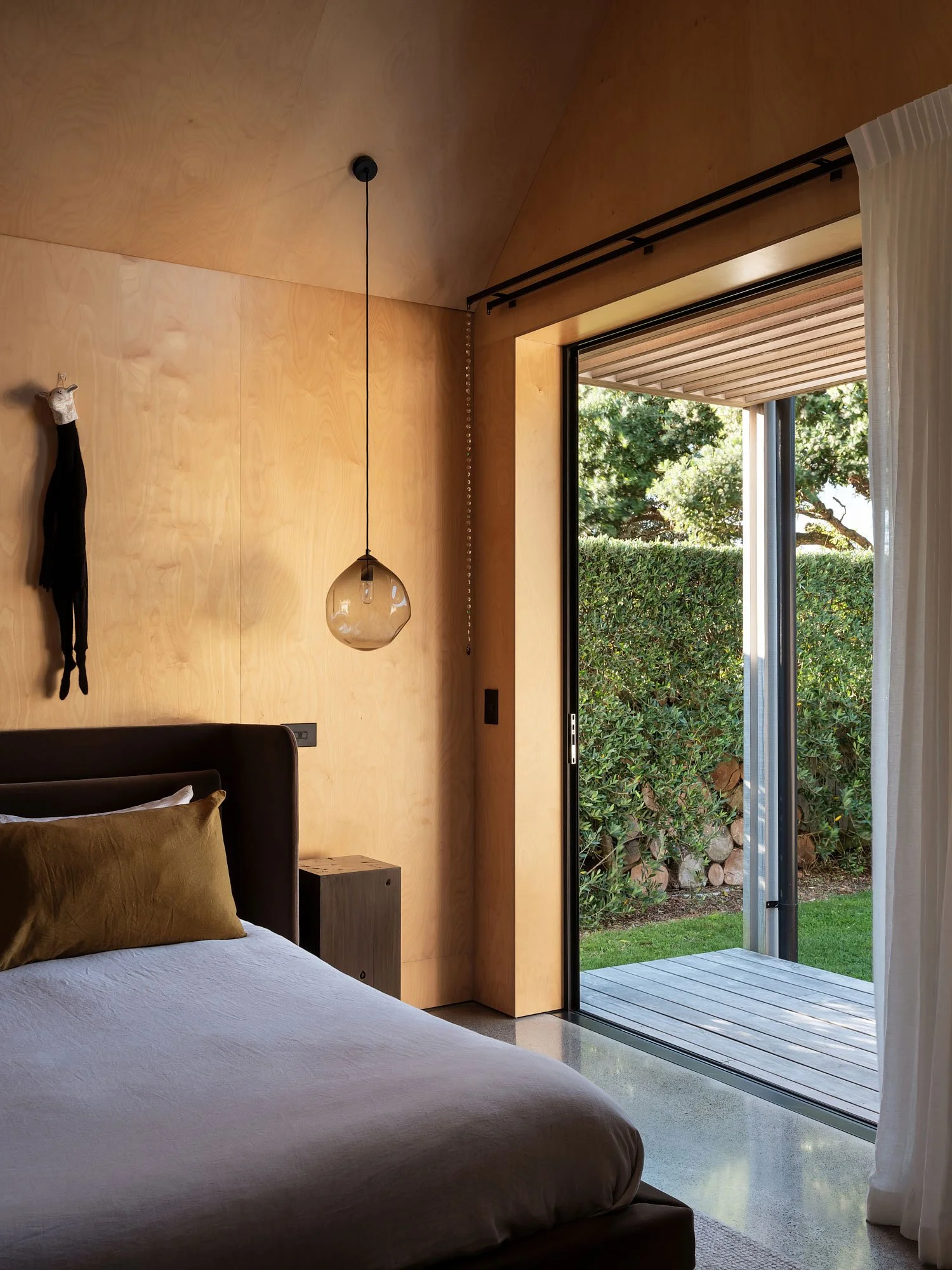 The central covered boardwalk, serving as the spine of the home, is a unifying element that ties together the series of forms. Pivot doors and over-wall sliders allow the openings to seamlessly disappear, blurring the lines between the interior and exterior. This central spine directs the flow through the new home to the bach beyond - establishing a clear sightline upon entering the home and preserving the connection to the original structure. A series of split posts define the edge of the boardwalk and create a soft boundary between the house and the surrounding grassed area - a gentle transition between spaces.