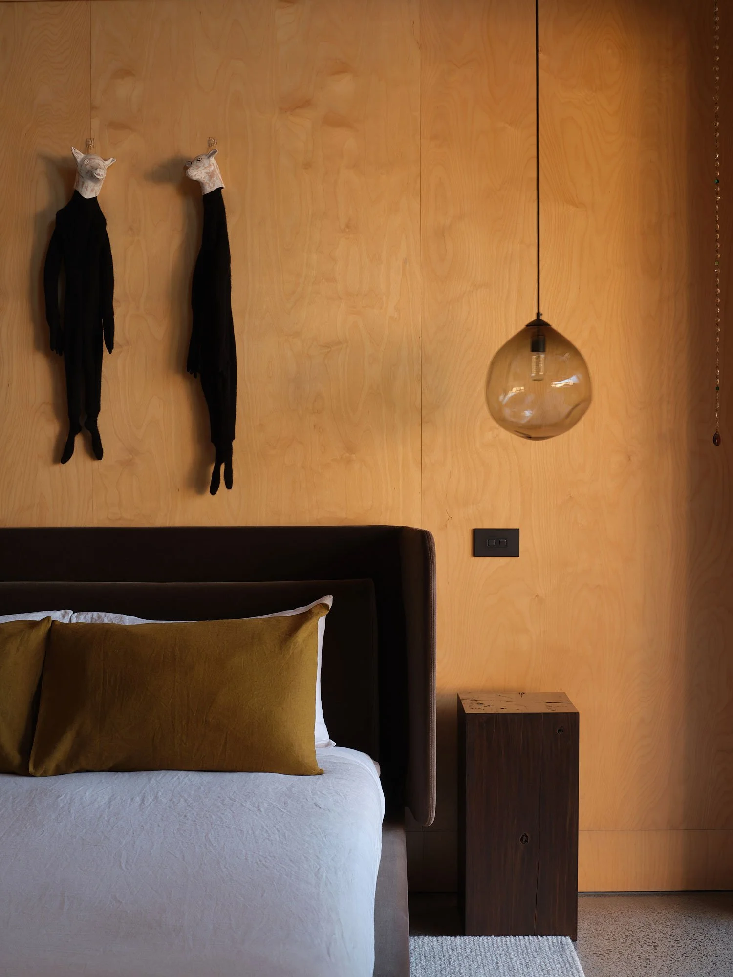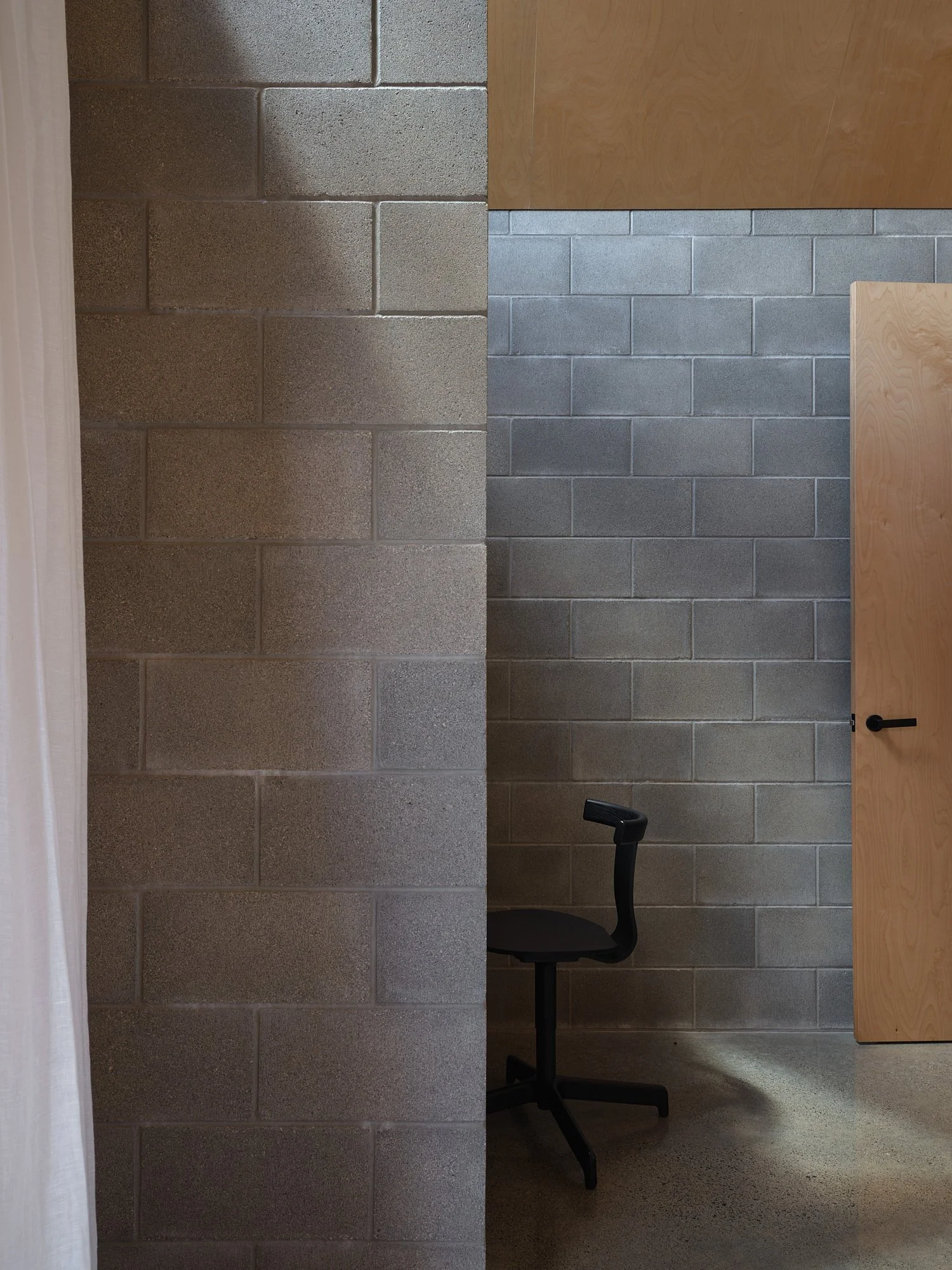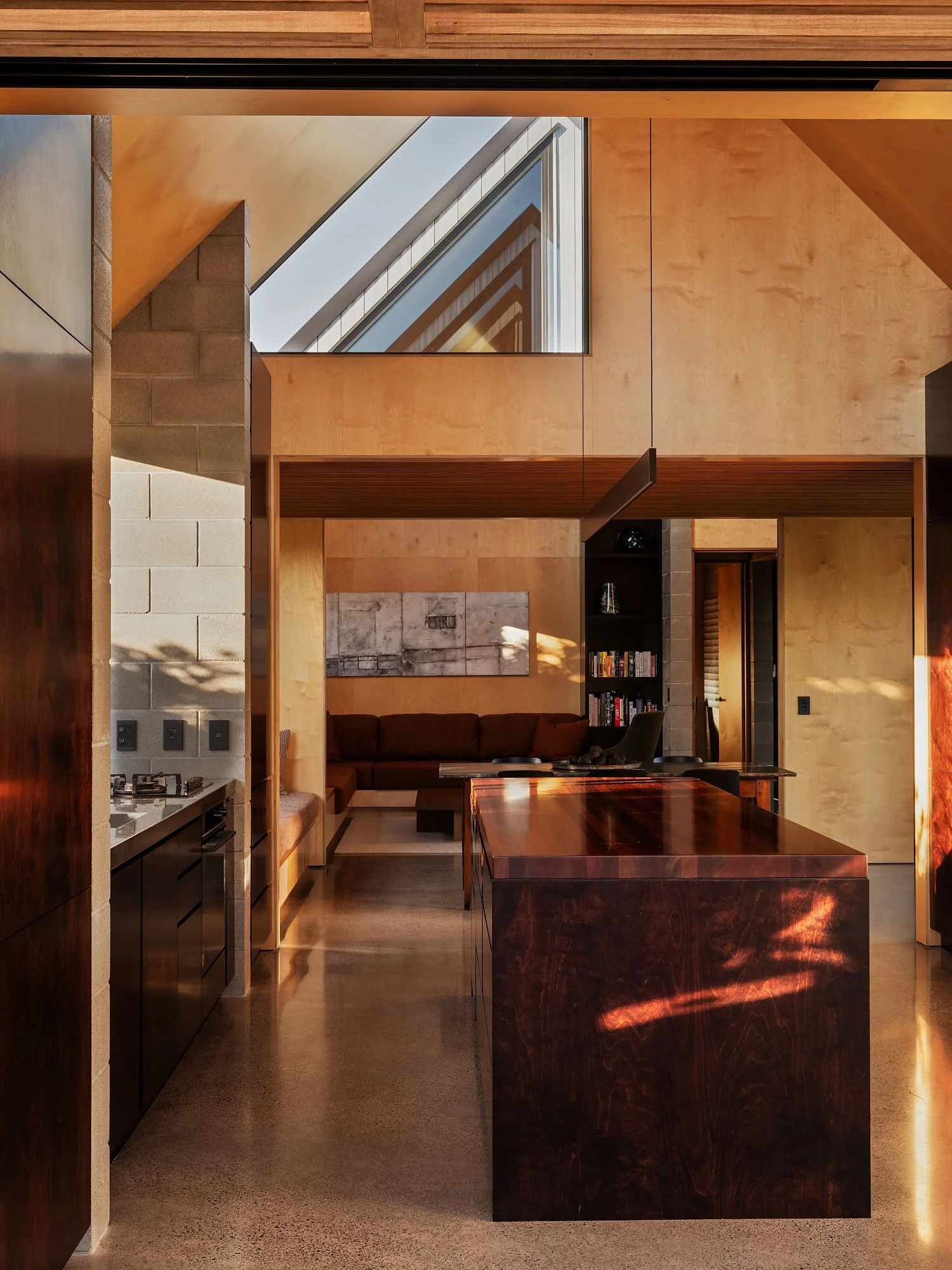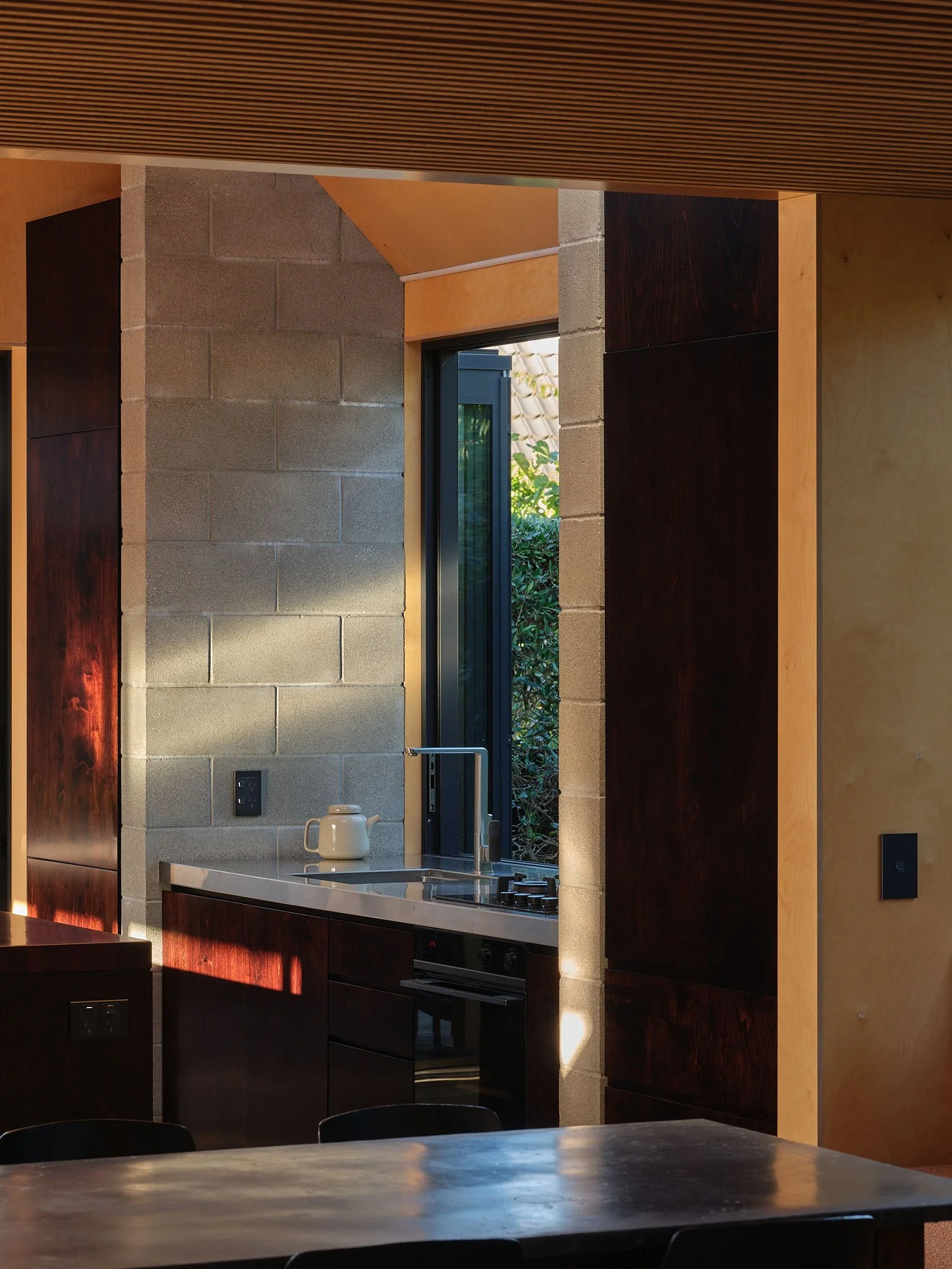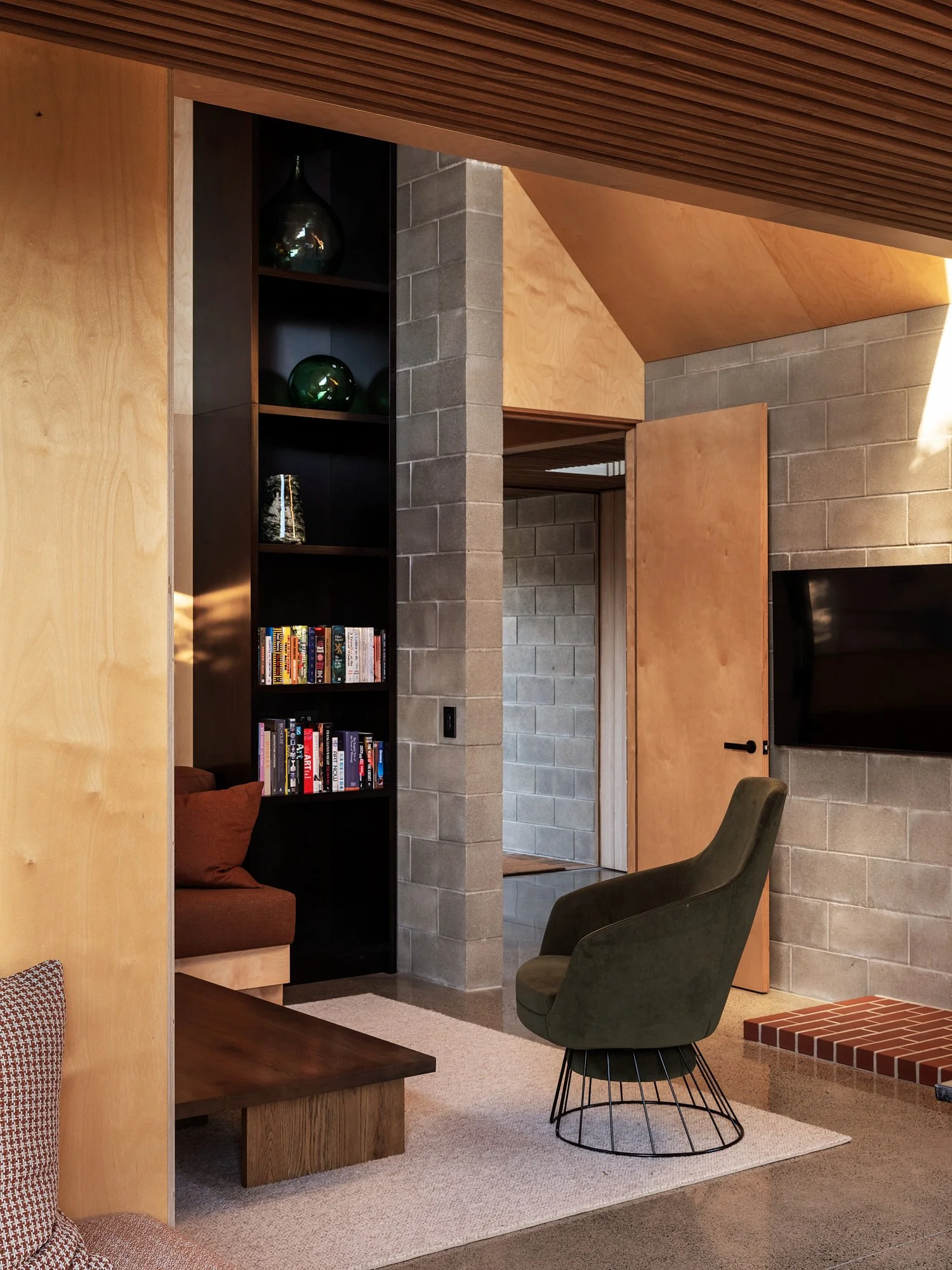 The interior spaces are defined by unpainted concrete block walls, creating solid edges to the central spine that separates the public and private areas. Smaller wing walls, crafted from the same blockwork, delineate functional zones within the kitchen and frame spaces, such as the study in the master bedroom and various window seats. The design was also driven by key aspects of the client’s daily routines. For instance, the inclusion of a dedicated coffee station was crucial for the perfect morning brew, and it was essential that this space remained separate to avoid disrupting the kitchen’s other functions. The block wing walls provided an ideal location for this, positioned opposite the main kitchen area.
