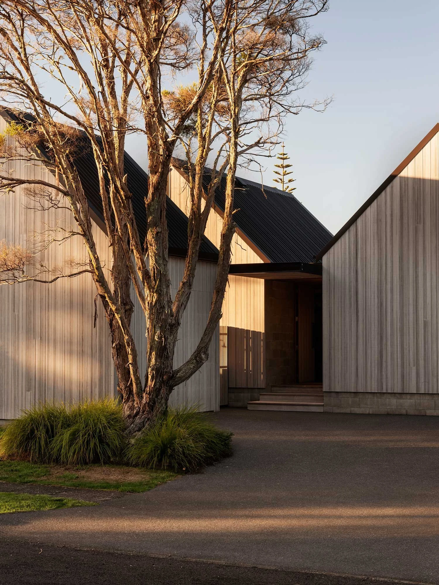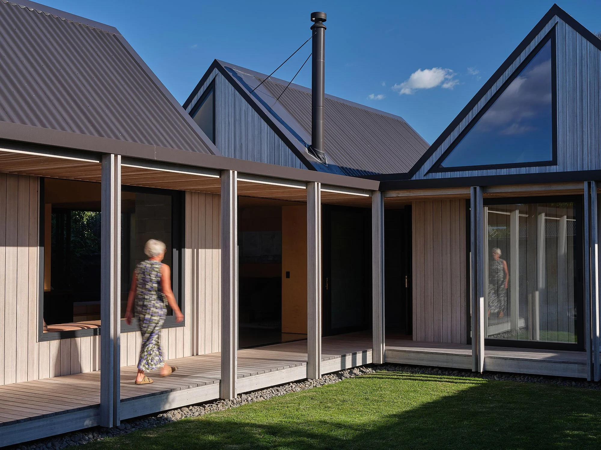 This house is conceived as a series of clustered pavilions, a response to the scale of the existing bach on the property. The bach’s loose arrangement of forms and constant interaction with outside informed some of the initial design thinking. The design began with a maximum building footprint, which was then divided into four small, pitched-roof structures linked by flat-roofed corridors. These pavilions are spread across the lawn, connected to the original bach by gardens and a boardwalk. A central design principle was to create independent, intentionally lofty pavilions with lower spaces between them, rather than overwhelming the site with one large house.