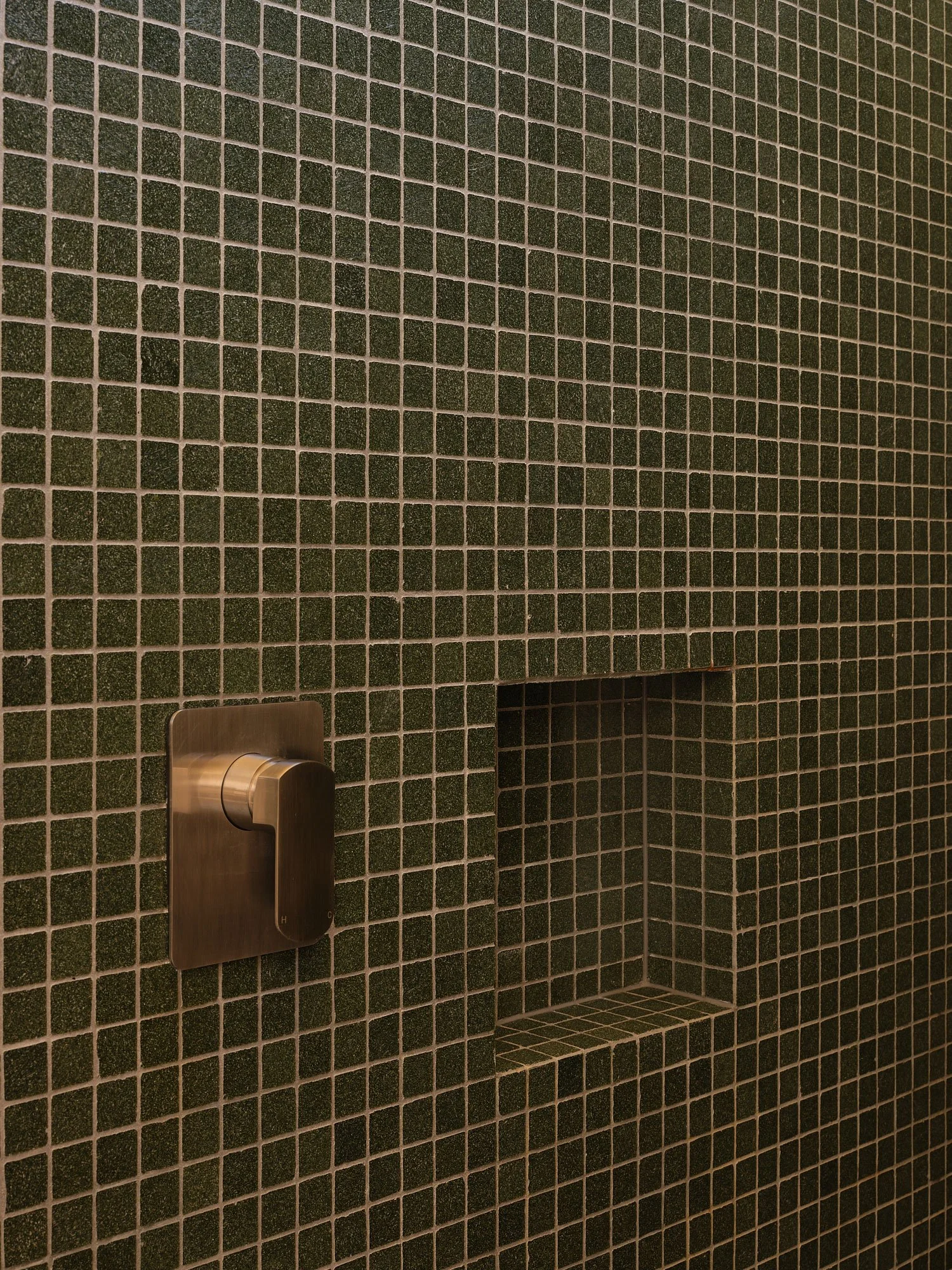 Soft furnishings on the built-in furniture further enhance the warm color palette that flows throughout the home. In contrast, the bathrooms feature striking floor-to-ceiling green glass mosaics, offering a sense of retreat and inward focus, providing a serene counterpoint to the openness and warmth found in the rest of the house.