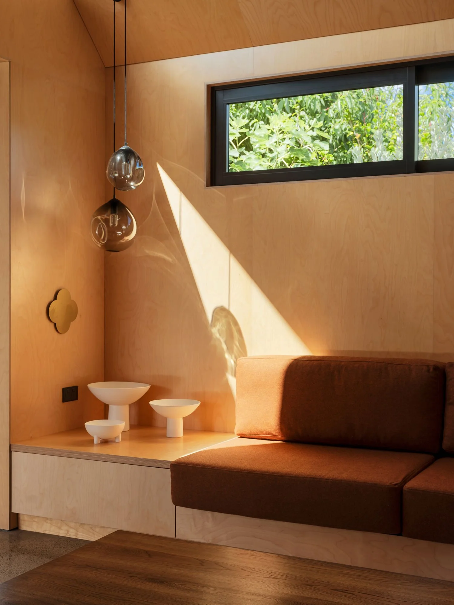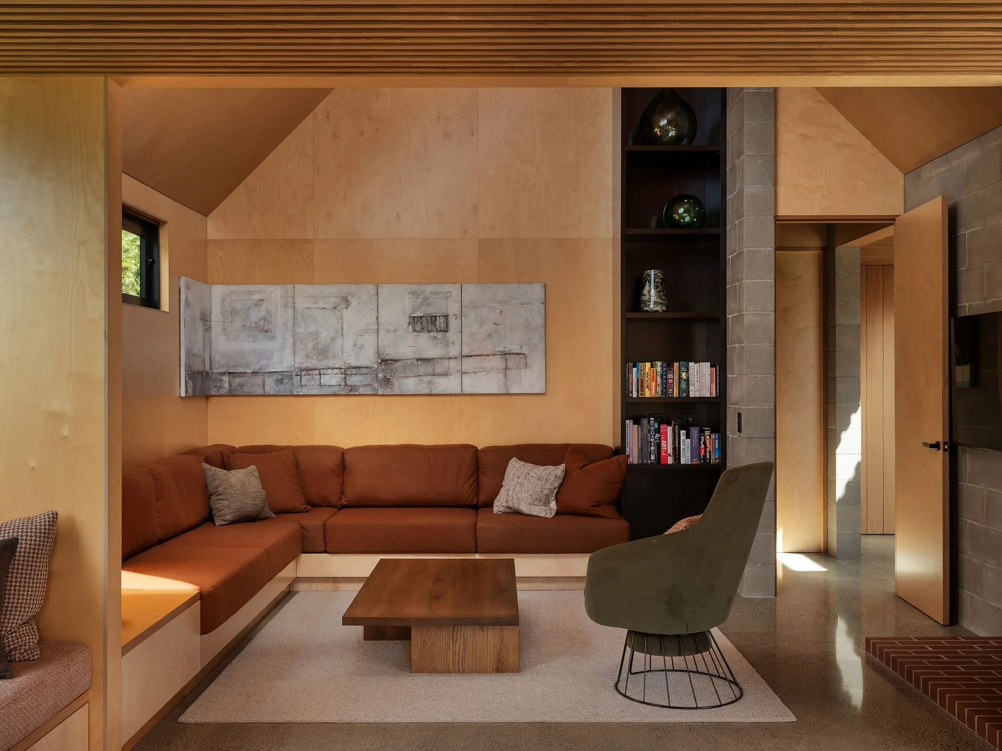 The pavilions, perfectly sized for their intended purpose, feature soaring vaulted ceilings and offset windows that allow sunlight deep into the spaces at various times throughout the day. This thoughtful design fosters a sense of ritual in daily life within the house. A window seat, bathed in morning sunlight, becomes the ideal spot for enjoying a coffee, while later in the day, another corner of the home offers the perfect nook to curl up and read in the warmth of the sun.