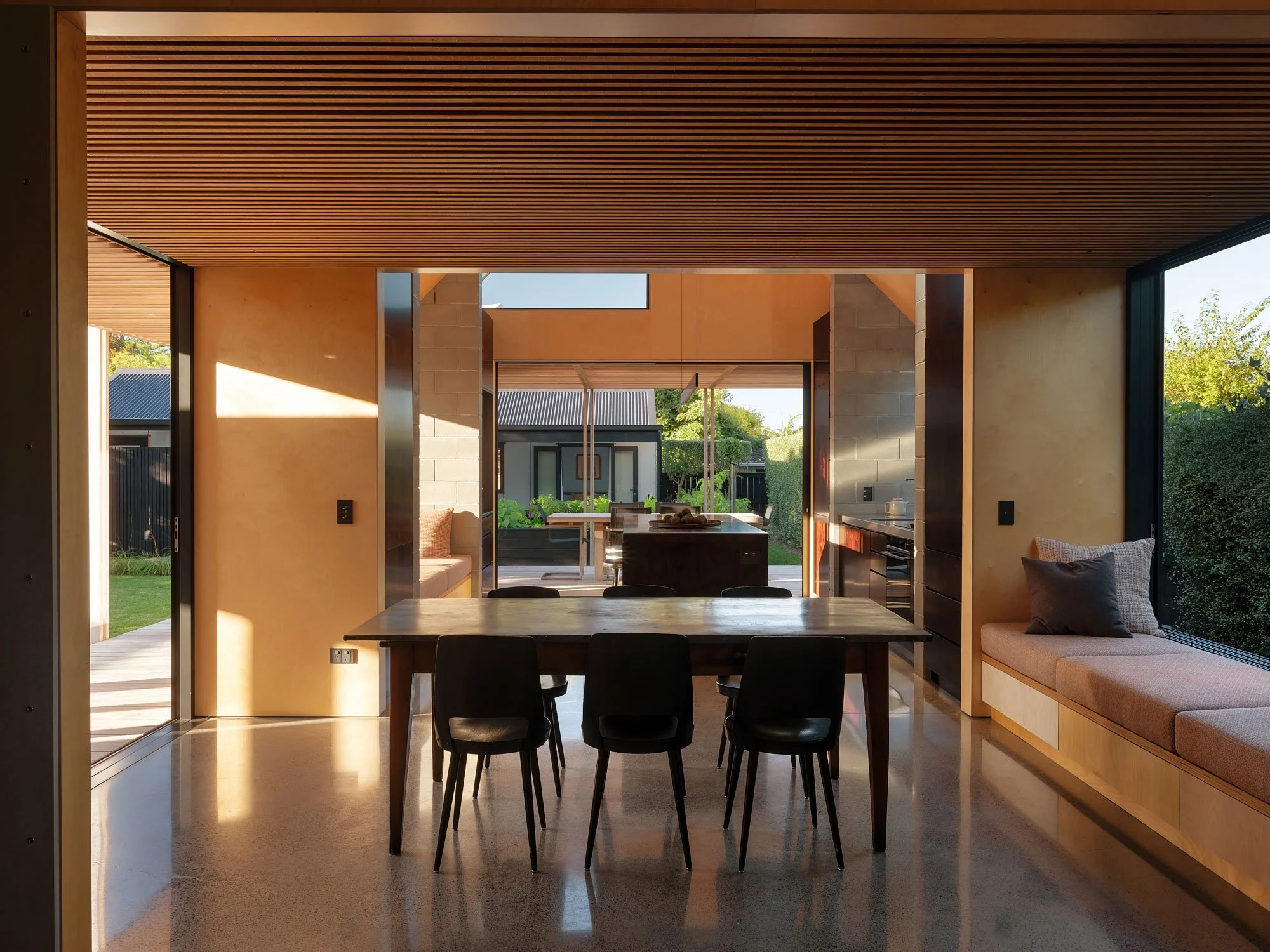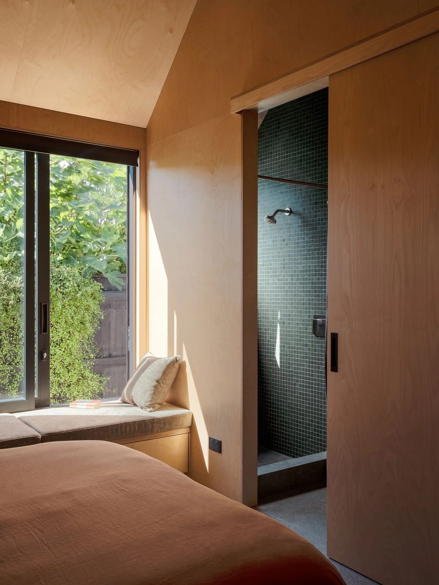 The front volume houses a garage and laundry, with a transparent link that feels more like a gate than a traditional front door. This entryway creates a transitional space -between the box containing the primary bedroom suite and another housing a guest bedroom, complete with a large window seat and ensuite. Behind the guest room, a cozy living area connects to the kitchen through a flat-roofed dining space.